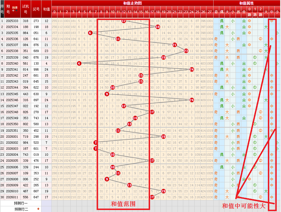 综上所述,本期和值区间8-16间,最佳和值区间10-14。