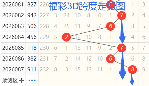 2)我们来看跨度;还是以83期——87期为例,如图依次是62768跨度,按照路数转换关系来看,那么跨度我们暂定147258跨 ,本期个人比较看好7 8跨。