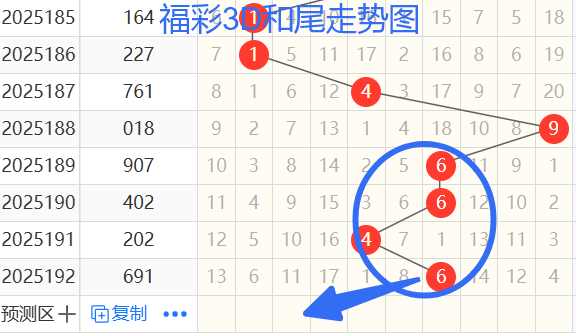 1)我们来看和尾,以188期——192期为例,如图依次是96646和尾,按照012路排序是00010路和尾,后面两期不是同路,今天就是0路或1路的和尾,为什么这么讲呢,这个是个大概率的问题,也是根据长期的研究规律定的,准确率相当高,我们定了0 1路的和尾,也就是0369147和尾,那么我们再来看和值,按照和值除3余数的话,可以分为余0 1 2路. 那么我们来看188期和值9余0,189期和值16余1,190期和值6余0,191期和值4余1,192期和值16余1,那么本期可余2,余0,根据上面的和尾那么就只有,20 12 14 16 18 这几个和值