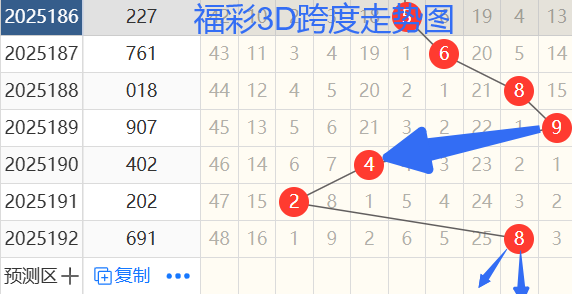 2)我们来看跨度;还是以188期——192期为例,如图依次是89428跨度,按照路数转换关系来看,那么跨度我们暂定1470369跨,本期个人比较看好7 8 6 跨。