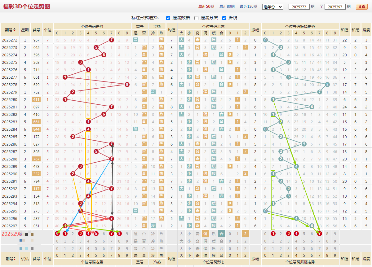 个位近期走势:4/2/7/5/7/3/2/4/7/4/3/3/7/1,从大小形态看小号偏多出9期,连出4期质奇本期重点合数偶数,如上图右边振幅绿色线1/4/7和0/4/6/7走势都符合常规开法对应数字8,绿色框框里等隔7期1对应数字02,见左边蓝色线7/4/1,黄色线2/3/4,红色线37/15都是等隔期,黄色框框里等隔6期,黑色7隔期3/1,从冷热形态看出了17期热号089处于冷态近期可关注,综合上图分析个位推荐:014578