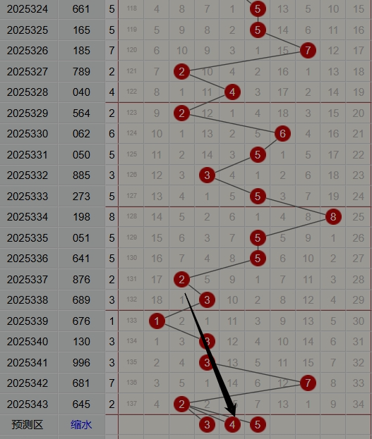 上期和尾为5,近5期和尾开出情况:第25337期开出1,属于奇数,1路号码,水属性;第25338期开出3,属于奇数,0路号码,木属性;第25340期开出4,属于偶数,1路号码,金属性;第25341期开出4,属于偶数,1路号码,金属性;第25342期开出5,属于奇数,2路号码,土属性;