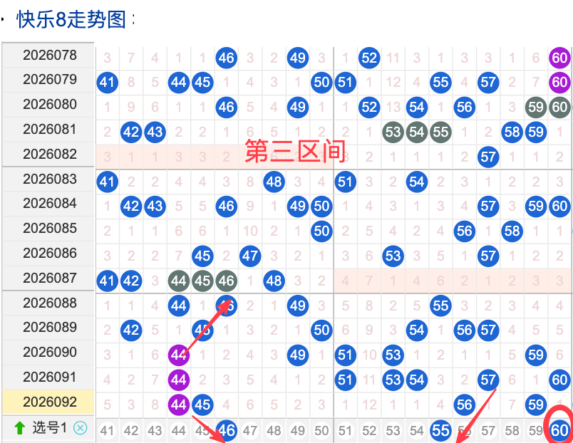 三区间开出了4个奖号(44.45.56.59)上期回顾三区开出4个奖号上期的三区间的奖号数量呈现一个递减的形态,4头回补2个,本期先来看号码46期出现频率相对来说还是很稳定。偶尔有时间隔期数也是很稳定,但是在近期的开奖中较热注意防守,号码55在近 30 期内出现次数相对还是稳定的号码,近期的活跃度也是较热。号码60有一定的间歇性,通常间隔5-3期会出现一次,没有明显的连续出现态势,走势相对还是很稳定,在整个第三区间的表现较热本期还是可以防守的。号码54走势相对近期较热,近期没有连续间隔落号的情况,活跃度近期处于热状态注意防守。