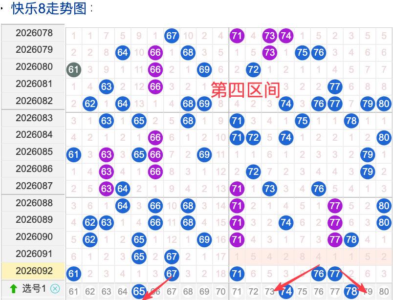 上期四区间开出了5个奖号(61.67.71.76.77)上期的四区开5个奖号呈现了一个递增趋势,开出的奖号6头回补2码,7头回补3个,先来看号码65在近 30 期内属于还是稳定的号码,近期出现频率相对热,偶尔会间隔多期后出现一次,这个号码要注意防守,号码74具有一定的间歇性近期活跃度是很稳定比如有时会间隔3到8期就再次出现,有时会间隔多期,近期整体出现频率比较热,近期还是要关注的.号码78活跃度近期比较稳定,有一定的间歇性,整体走势有一定的波动性.