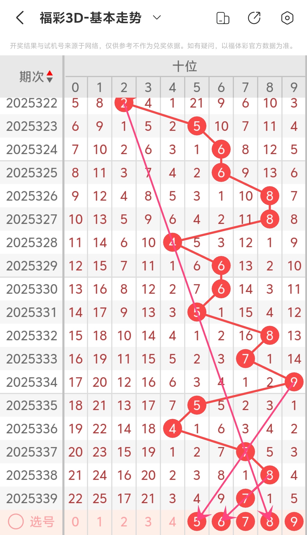 上期十位开出7,本区与上期的跨度为1,本期我们可以从上面走势图中看出选号的思路,5为斜连走势跨度为二,6为斜三连走势跨度为一,7为重码,8为斜连走势跨一,综合以上分析,本期十位推荐:56789