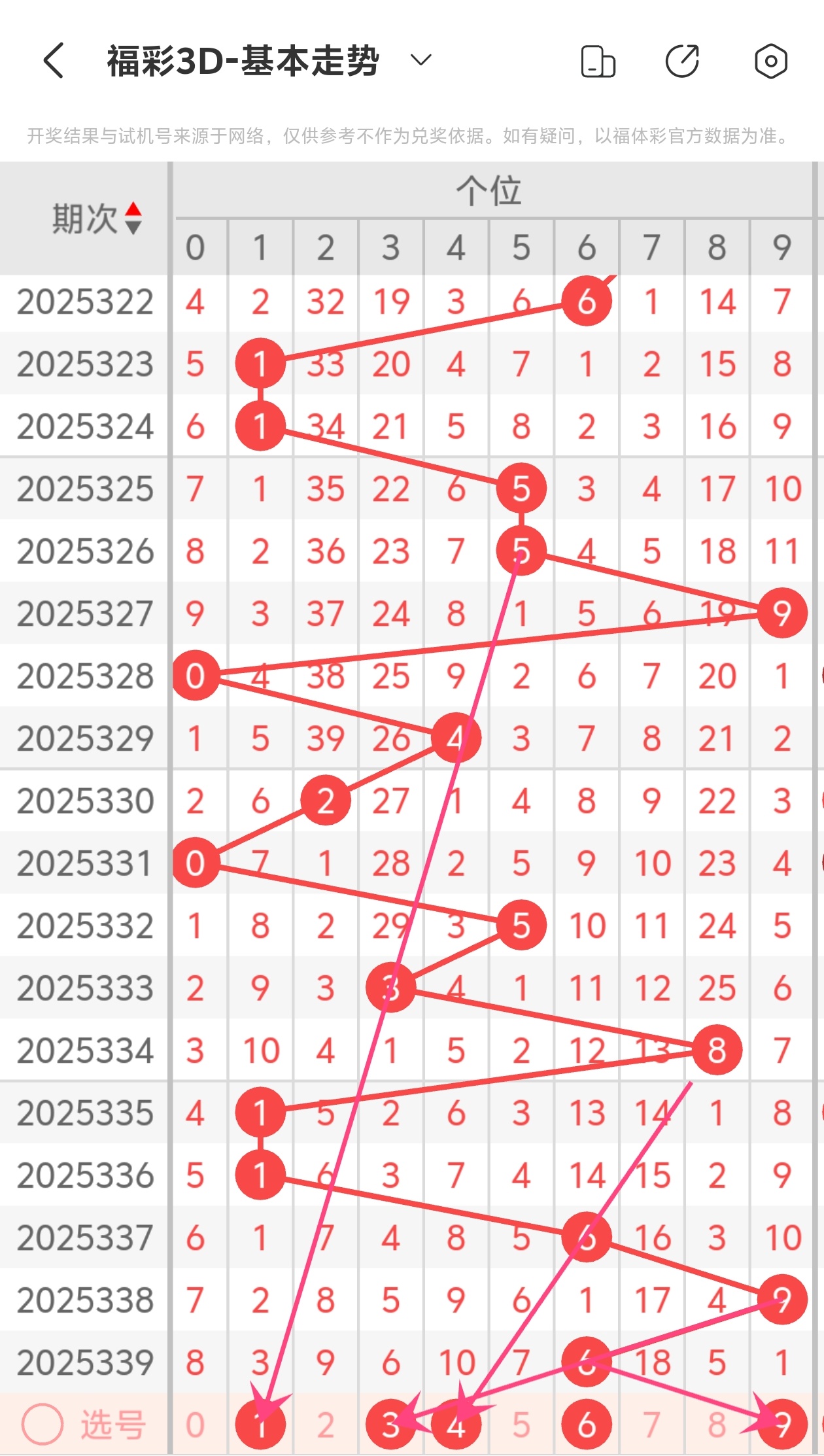 上期个位开出6,本区与上期的跨度为3,本期我们可以从上面走势图中看出选号的思路,1为斜连走势跨度为五,3为斜连走势跨度为三,4为斜连走势跨二,6为重码,9为隔期回补号,综合以上分析,本期个位推荐:13469