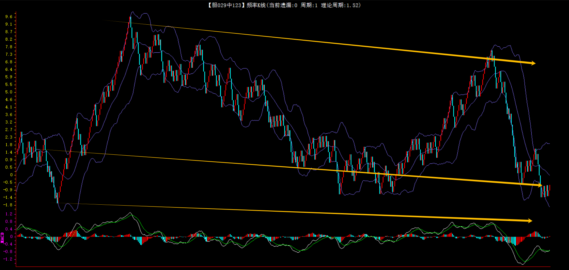 整体趋势下行,上边沿线趋势向下,下边沿趋势也是向下,节点震荡,当前连开2期,本期防守。