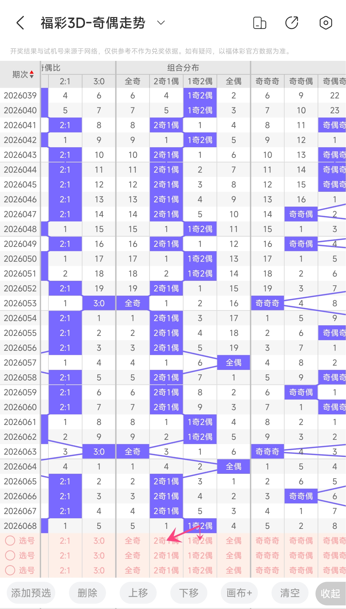 上期开了1奇2偶的情况,往前一期开出的是2奇1偶。从组合数学理论上来讲,开出2奇1偶和1奇2偶的概率都为37.5%,开出全偶和全奇的概率为12.5%。通过分析目前30期内的数据。本期的开出全偶的概率是6.66%,开出全奇的概率为6.66%,开出1奇2偶的概率为30%,开出2奇1偶的概率是56.66%。和前一期相比,概率没有变化。通过走势图分析,上期开了1奇2偶,推测本期可能开2奇1偶,其次是1奇2偶,然后是全奇或者全偶类型。