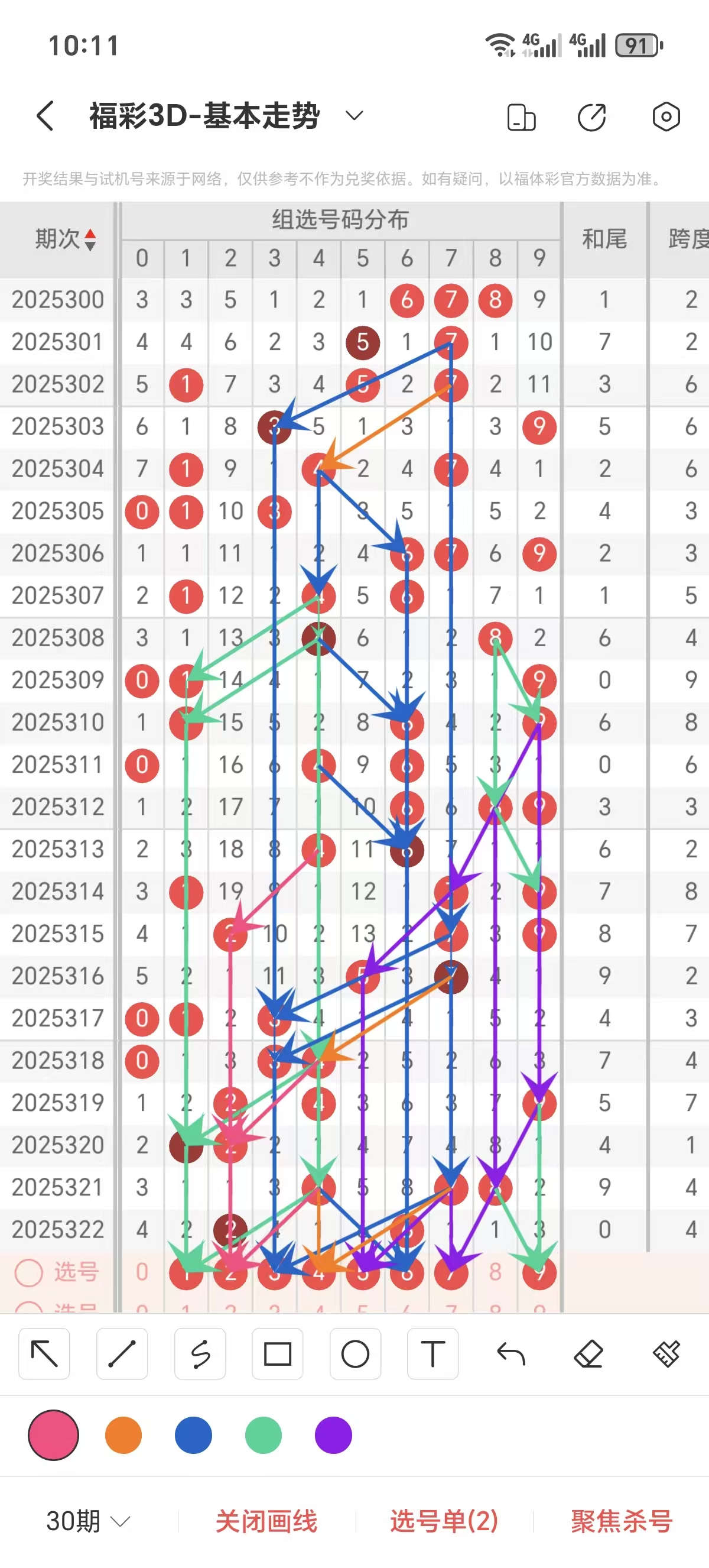 跨度通常情况下在五期之内重复一个跨度的概率很高,近五期重复了4的跨度,近五期跨度为4/7/1/4/4,近期1路的跨度较热,上期是1路的跨度,本期要侧重跨度以5/6跨为主的号码组合。可以从跨度方面选择相应的双胆码组合,双胆码的选取要根据近期和历史的走势进一步的分析选取。