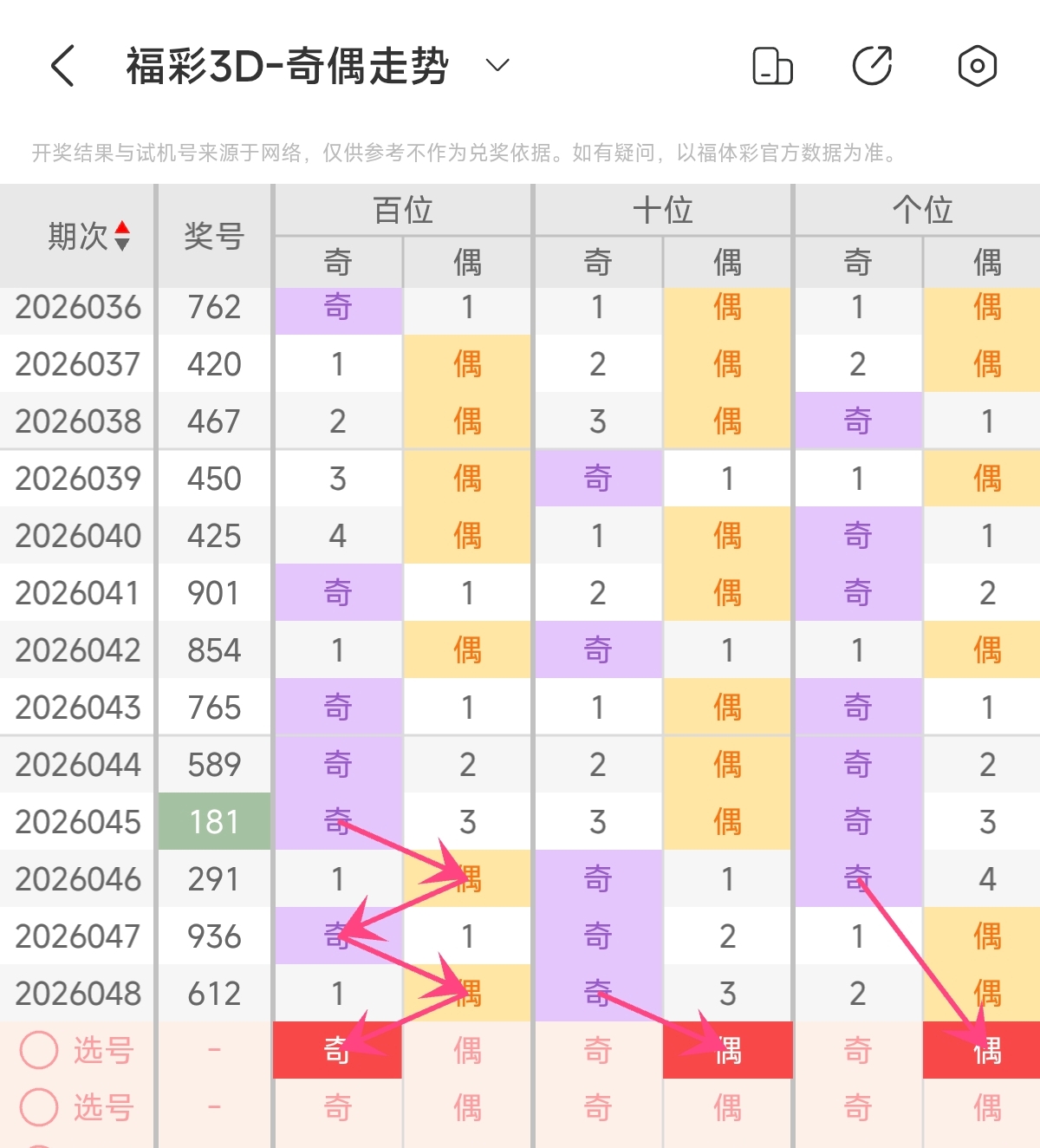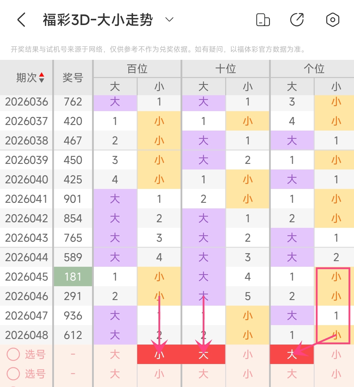 首先让我们回顾一下上期福彩3D第2026048期开奖号码为612,为组六形态,大小比为1:2,奇偶比为1:2,跨度为5,和值为9。