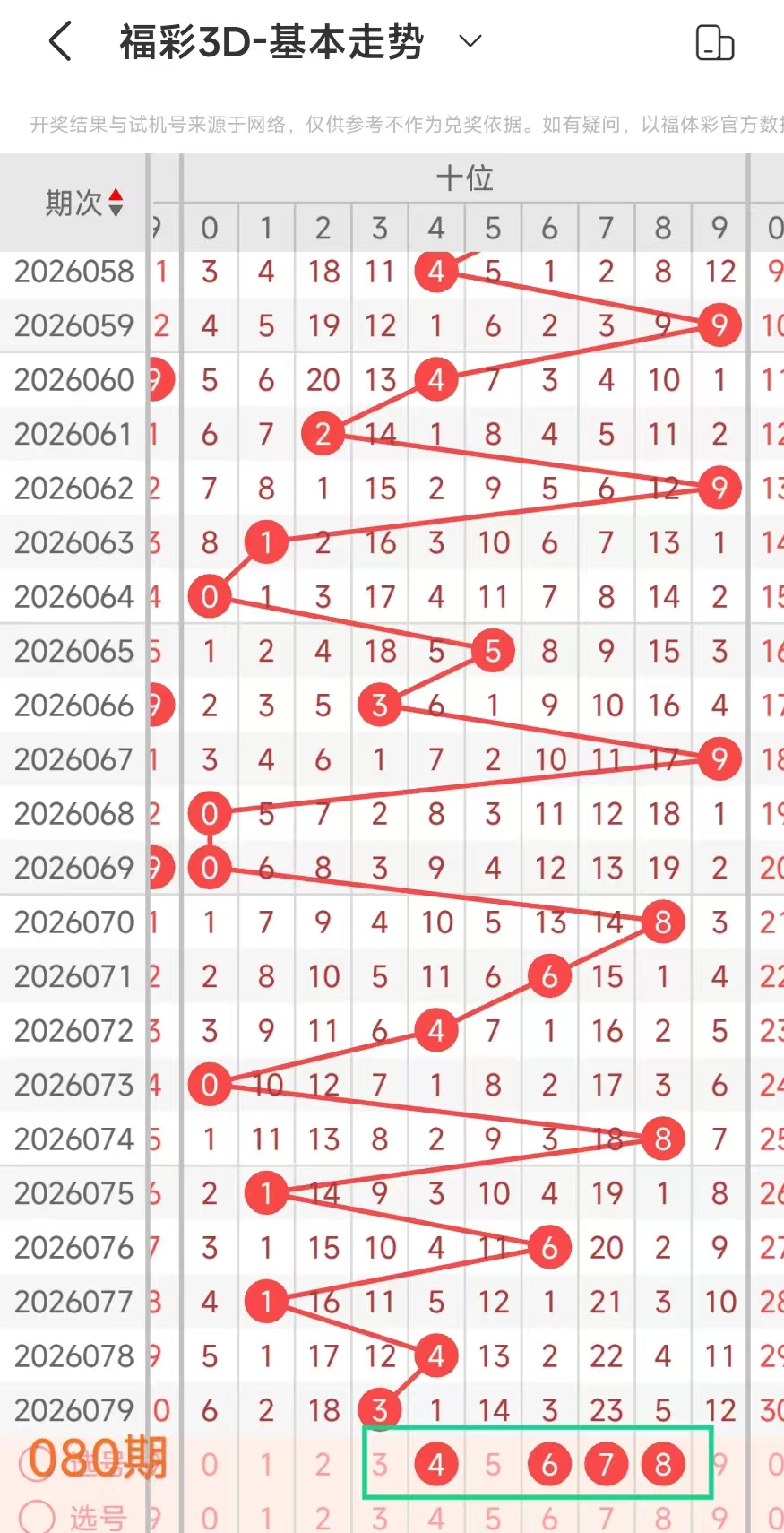 经统计0号出现6次、1号出现4次、2号出现6次、3号出现9次、4号出现7次、5号出7次、6号出现6次、7号出8次、8号出现9次、9号出现3次.统计后出现次数靠前的数字作为我们的备选号码.其号码有02345678等