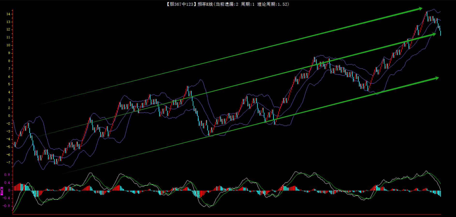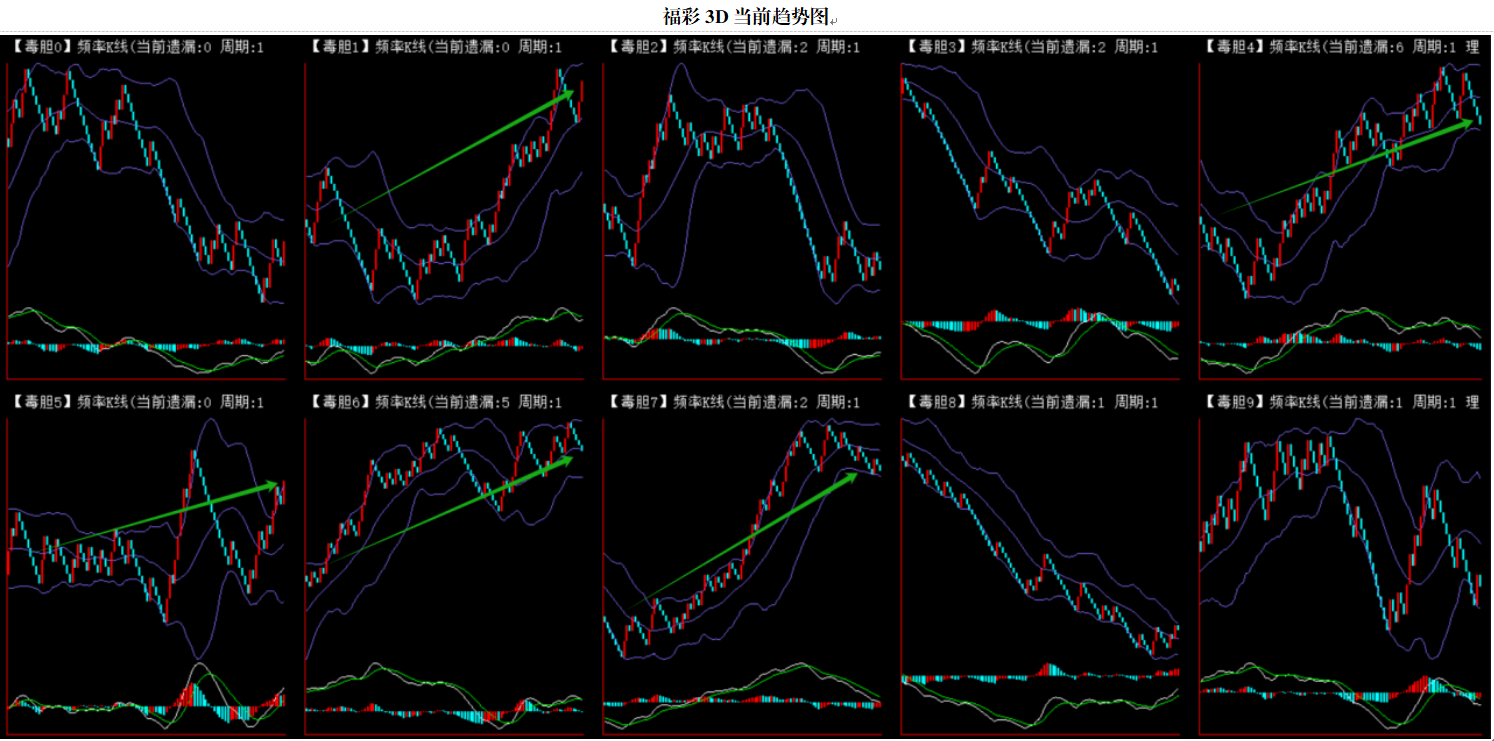 整体趋势上行,上边沿线趋势向上,下边沿趋势也是向上,节点震荡,当前遗漏2期,本期关注。