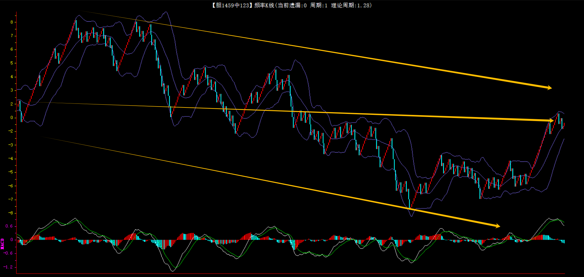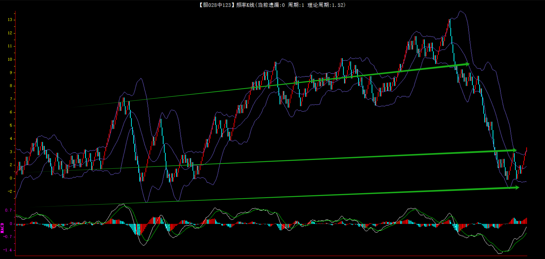 整体趋势下行,上边沿线趋势向下,下边沿趋势也是向下,节点震荡,当前连开2期,本期防守。