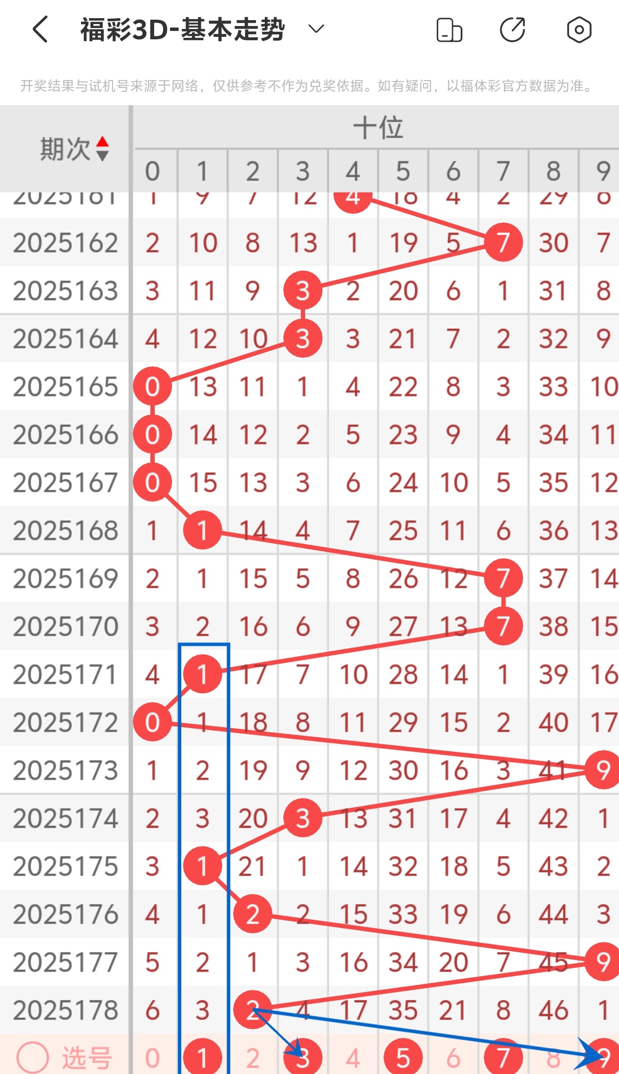 上期个位开出8,本区与上期的跨度为1,本期我们可以从上面走势图中看出选号的思路,2为对称走势跨度为六,8为斜连走势,9为斜三连走势跨一,综合以上分析,本期个位推荐:23789