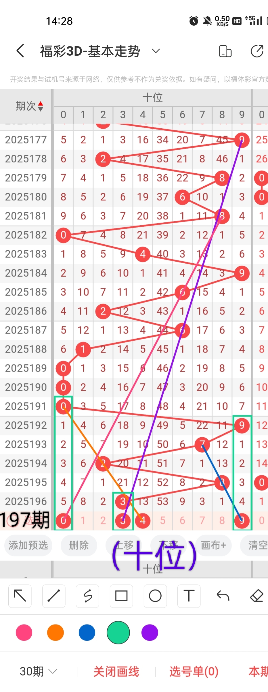 首先,小梁为了感谢各位老板的关注和打赏,特提供一个杀个位的小技巧,同尾杀号法,准确率相当高。根据同尾杀号法,得知本期杀个位7。其次,我们根据图中画线的思路可以看出,号码0与前几期开出的号码呈隔期回补的走势且呈斜三连的走位,跨度为4;号码1与前几期开出的号码呈斜连的走势且呈连续隔四期回补的走位,跨度为3;遗落26期未出的号码5与前几期开出的号码呈斜三连的走势,跨度为1;号码8与前几期开出号码呈斜三连的走势且呈隔八期回补的走位,跨度为4。综上所述,小梁依据图中画线思路预测个位开出的号码为0、1、5、8。