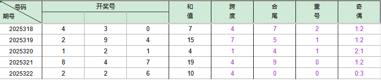 2025318期开奖号码430,我们可以看出近30期百位4出现3次(较319期减一),十位3出现3次(较320期减一),个位0出现4次。