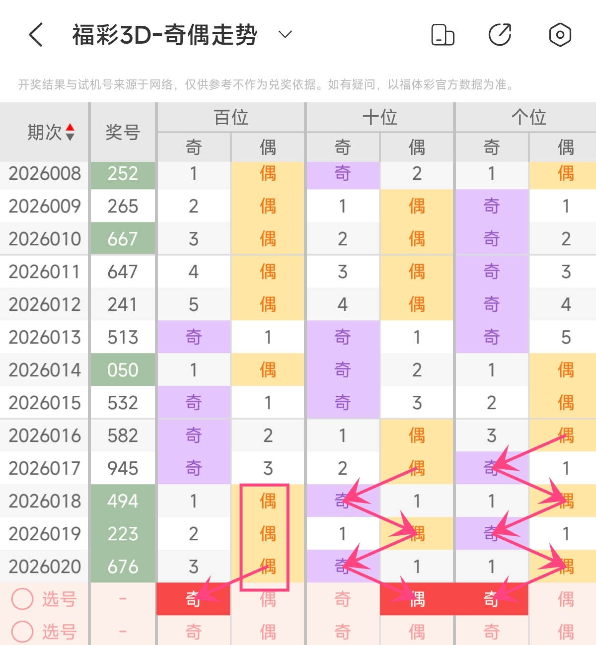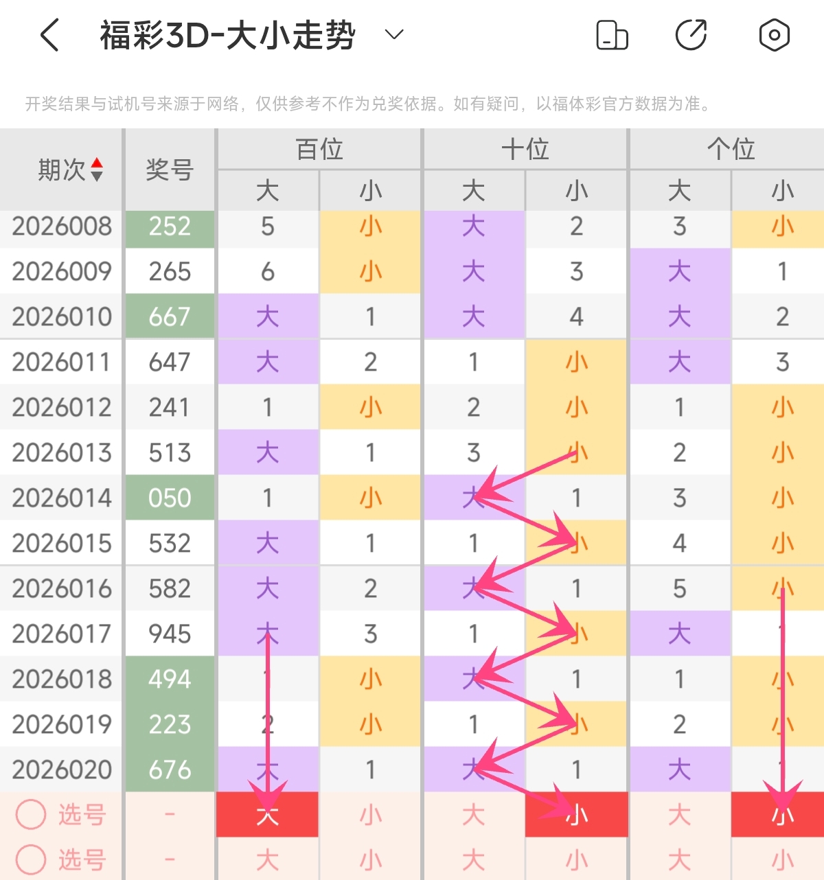 首先让我们回顾一下上期福彩3D第2026020期开奖号码为676 ,为组三形态,大小比为3:0,奇偶比为1:2,跨度为1,和值为19。
