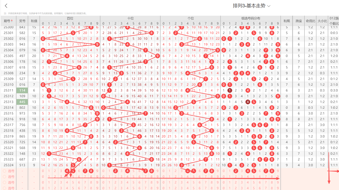 ①百位:上期开出大号奇数5号 ,在历史开奖记录中显示一般正常的奇偶周期平均在1~3期为普遍现象,上期出现奇偶互变开出奇数2路号码,依据奇偶以及012路周期性规律的转变特征点即本期1路号码有开出的趋势2路适当注意考虑。一般大小变化的周期同样均在1~3期之间变化,上期开出大号依据大小周期性规律特征本期可以适当关注小号的表现;