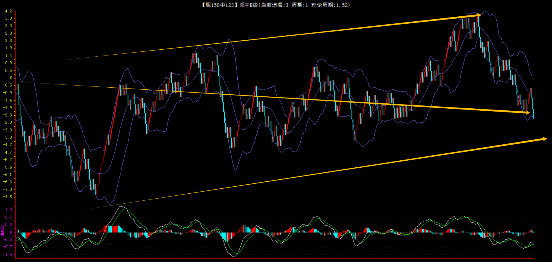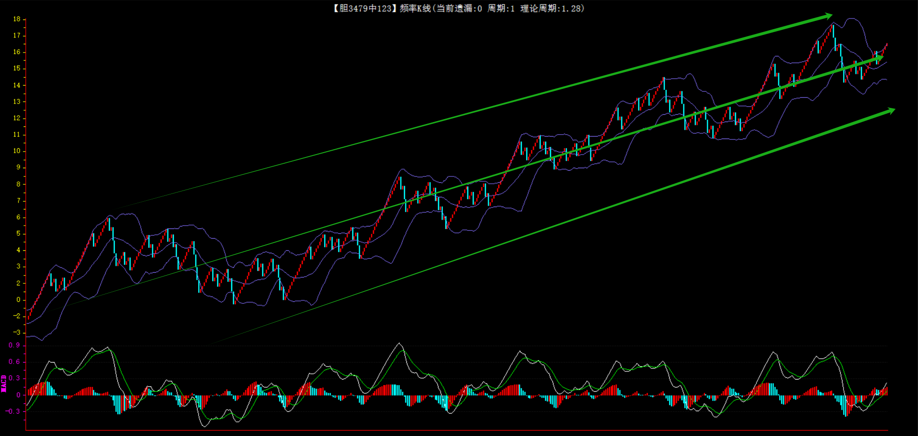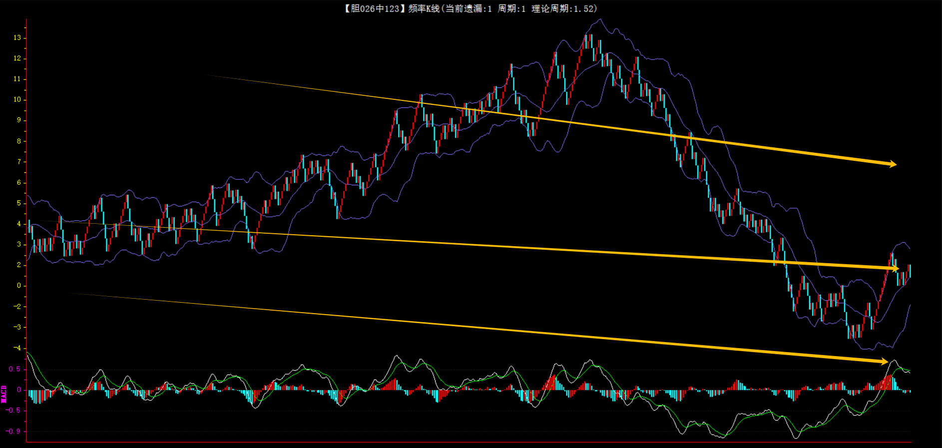 整体趋势下行,上边沿线趋势向下,下边沿趋势也是向下,节点震荡,当前遗漏1期,本期防守。