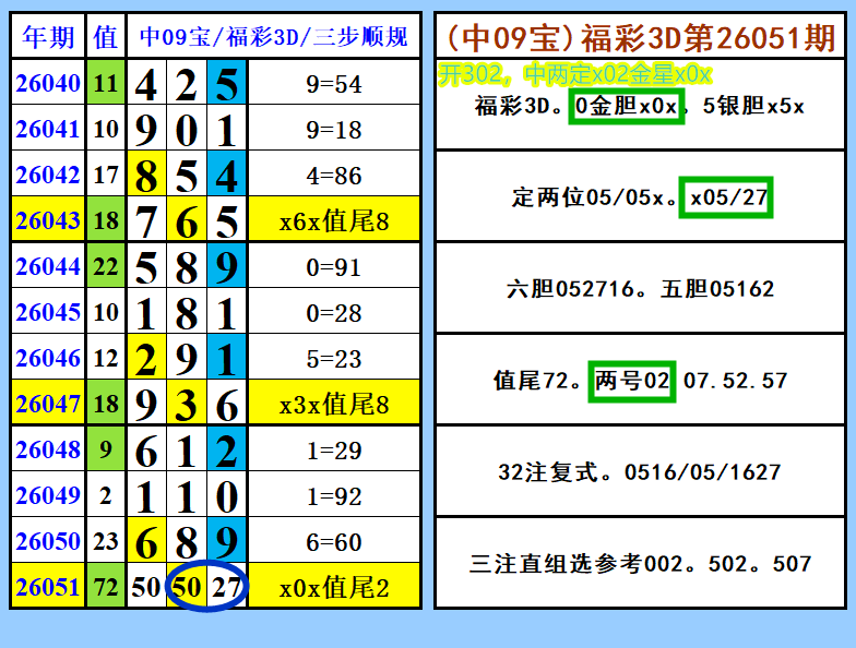 26051 期开奖号码为 302。