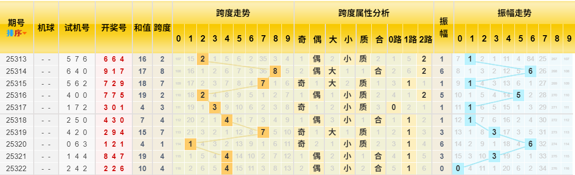 近10期跨度值(截至322期)为:2, 8, 7, 2, 3, 4, 7, 1, 4, 4。跨度4在近期频繁出现。从分布看,中小跨度(3-6)仍是主流。本期预计跨度在中小区间内调整,重点关注 跨度3或5。