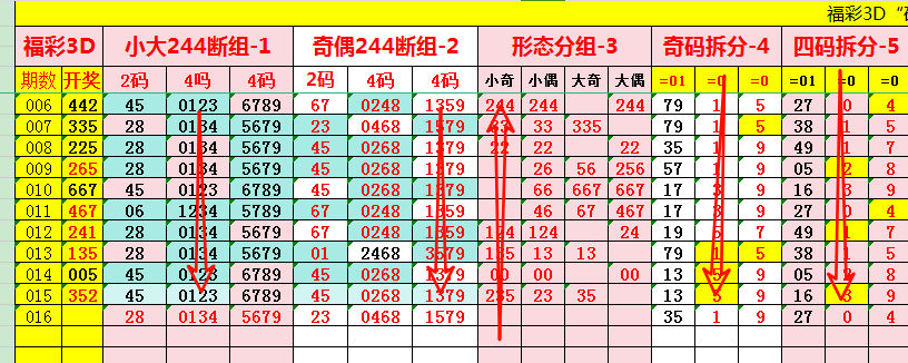 接下来看两个244断组信息,筛选优质胆码组 “小大244断组”与“奇偶244断组”,本质是通过数据分区判断数字活跃度,捕捉胆码组。