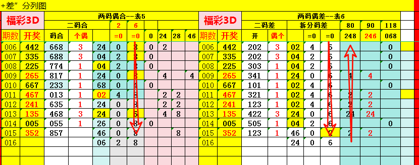 继续看上表4、表5,即奇偶拆分,此项分析的价值,并非盲目,而是规避大概率不出的号码,提升选号效率。通过奇码拆分与四码拆分数据观察:可以进一步筛选要排除的号码,即本本期大概率不出。通过复盘历史数据,本期参考砍两码0 1;侧重砍号码--1;