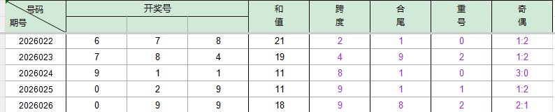 2026022期开奖号码678,我们可以看出近30期百位6出现5次(较024期减2),十位7出现4次,个位8出现3次。