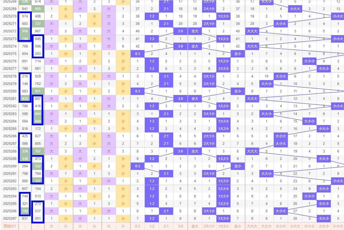 大小走势分析: 在福彩3D/的大小走势中,近期数据显示大小组合分布较为均衡,但细致观察历史数据,发现大小组合呈现出一定的周期性变化。因此,对于第298期预测大小比例可能为1:2或2:1。考虑到近期小号略有增多,建议重点关注大小比例为1:2的组合,即两个小号搭配一个大号,防全大