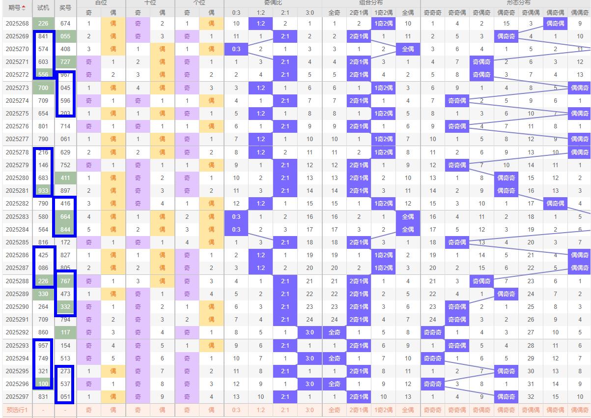 奇偶比例预判 在奇偶比例方面,第297期开出了051偶奇奇的组合,显示出奇数号码的强势。然而,根据奇偶比例的自然平衡原理,偶数号码在第298期有望得到更多的关注。因此,298期的奇偶比例可能为1:2,即偶数号码占据多数。这种预判基于对历史数据的深入分析,以及对奇偶比例波动规律的把握。
