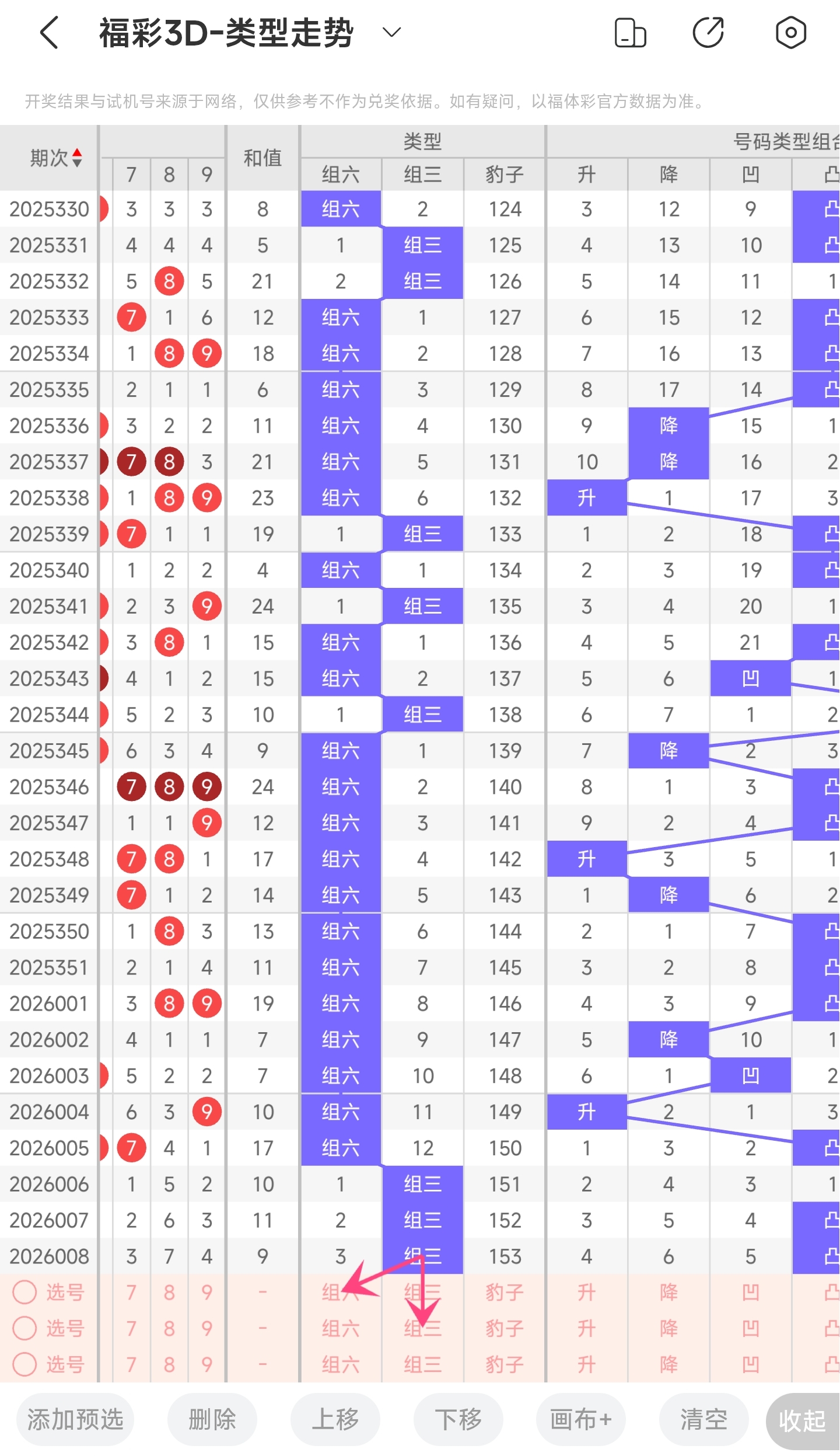 上期开出了组三类型,往前一期是组三类型。理论上开出组六的概率是72%,开出组三的概率是27%,开出豹子的概率是1%。通过分析目前30期内已经开出的概率,组六概率为73.33%,开出组三概率是26.66%。开出豹子的概率为0%。与前一期相比,组六概率变小,组三概率变大概率没有变化。通过走势图可以看到连续开了3期组三,本期看好组六。所以本期大概率开组六,小概率开组三。