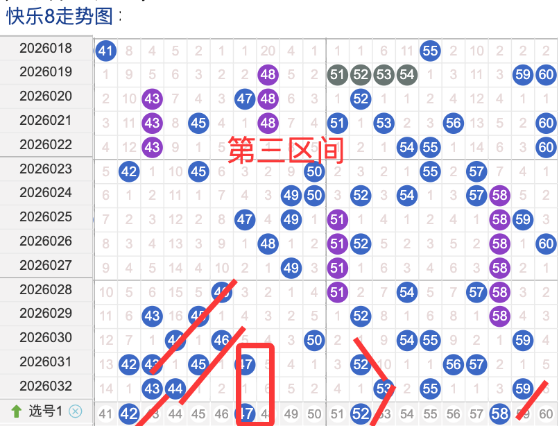 三区间开出了5个奖号(43.44.53.55.59)上期回顾三区开出5个奖号上期的三区间的奖号数量呈现一个递减的形态,4头回补2号码,本期先来看号码42近期出现频率相对来说不是很稳定。偶尔有时间隔期数也是很长,说明其在近期的开奖中较温冷的,号码47在近 30 期内出现次数相对较还是稳定的号码,近期的活跃度也是较稳。号码52有一定的间歇性,通常间隔5-3期会出现一次,没有明显的连续出现态势,走势相对还是很稳定,在整个第三区间的表现本期还是可以防守的。号码58走势相对近期较热,近期有连续间隔落号的情况,活跃度近期处于较热状态注意防守。
