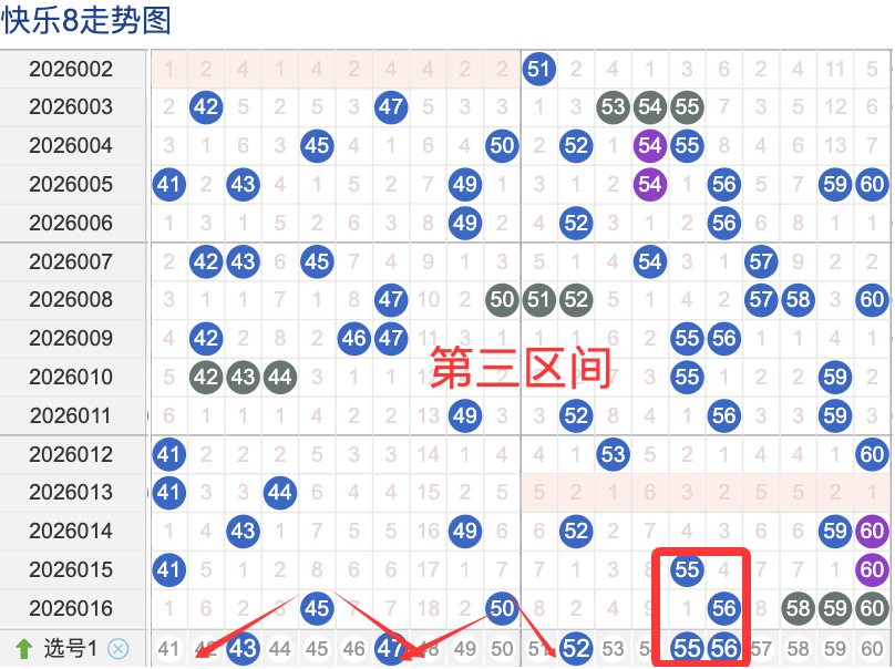 三区间开出了6个奖号(45.50.56.58.59.60)上期回顾三区开出6个奖号上期的三区间的奖号数量呈现一个递增的形态,4头回补1个号码,本期先来看号码43近期出现频率相对来说还是很稳定。偶尔有时间隔期数也是很长,说明其在近期的开奖中较热的,号码47在近 30 期内出现次数相对较稳定的号码,近期的活跃度也是较热。号码52有一定的间歇性,通常间隔5-3期会出现一次,没有明显的连续出现态势,走势相对较热,在整个第三区间的表现本期还是可以防守的。号码56走势相对近期较温热,近期没有连续间隔落号的情况,活跃度近期处于较温热状态注意防守。