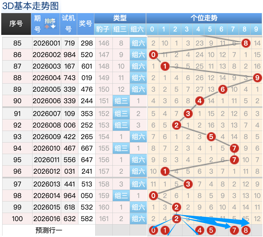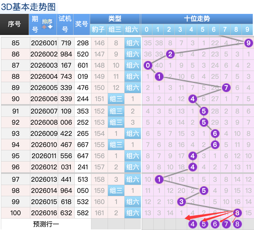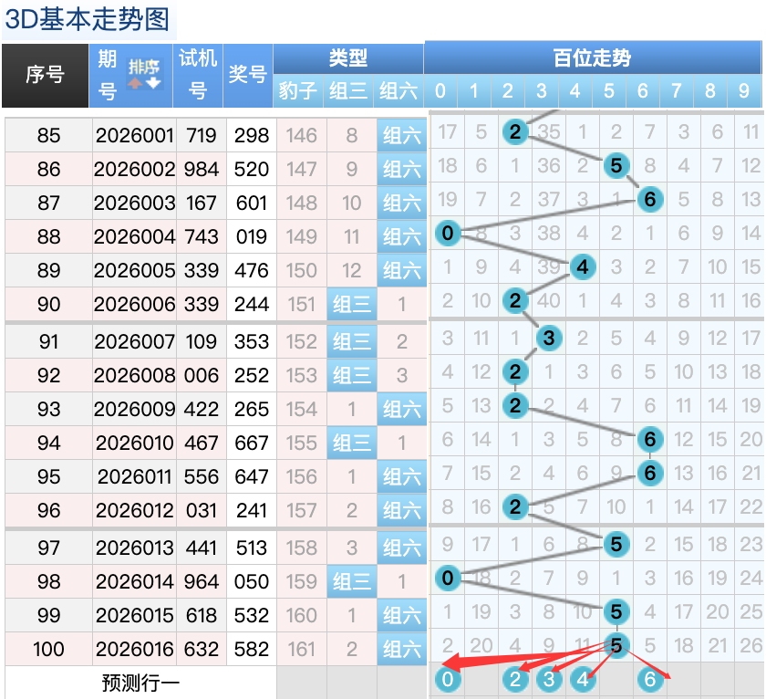 3D上期百位开出的5球,这个奖号是一个冷码的重码补落位趋势也是一个比较好的符合百位上的落位点,先来看0号球这里还是有机会继续走出一个折返的趋势的回补号码,还有一个就是4号球和6号球这里的双分码的落位形态的概率在这里的机会还是很好的要注意防守,然后8号球这里要注意是一个3跨回补落位趋势要注意防守,2号球在百位上要注意可能有机会走出热码的落位注意防守 。