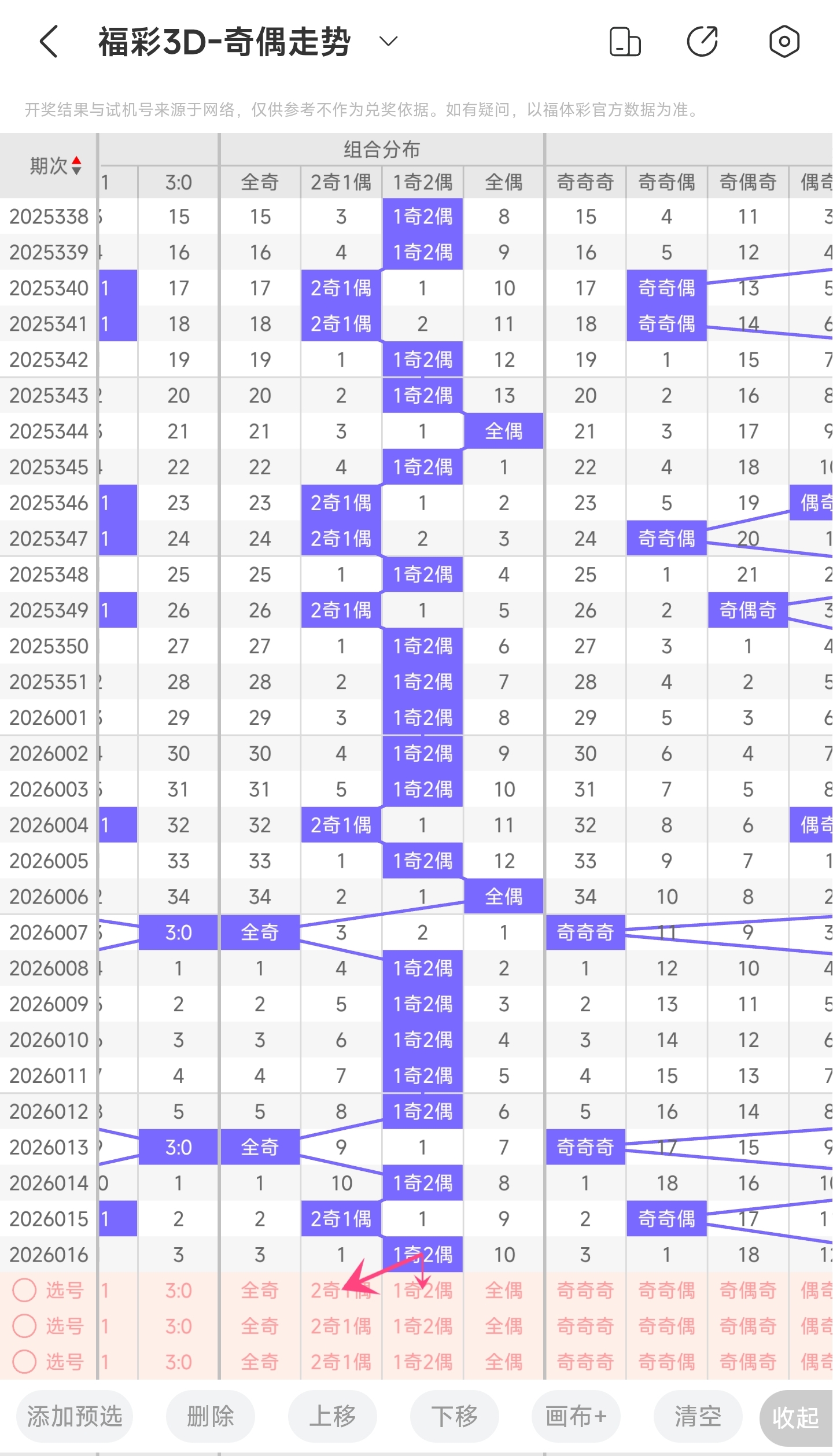 上期开了1奇2偶的情况,往前一期开出的是2奇1偶。从组合数学理论上来讲,开出2奇1偶和1奇2偶的概率都为37.5%,开出全偶和全奇的概率为12.5%。通过分析目前30期内的数据。本期的开出全偶的概率是6.66%,开出全奇的概率为6.66%,开出1奇2偶的概率为63.33%,开出2奇1偶的概率是23.33%。和前一期相比,概率没有变化。通过走势图分析,本期看好2奇1偶回补。所以本期推测可能开2奇1偶,其次是1奇2偶,然后是全奇或者全偶类型。