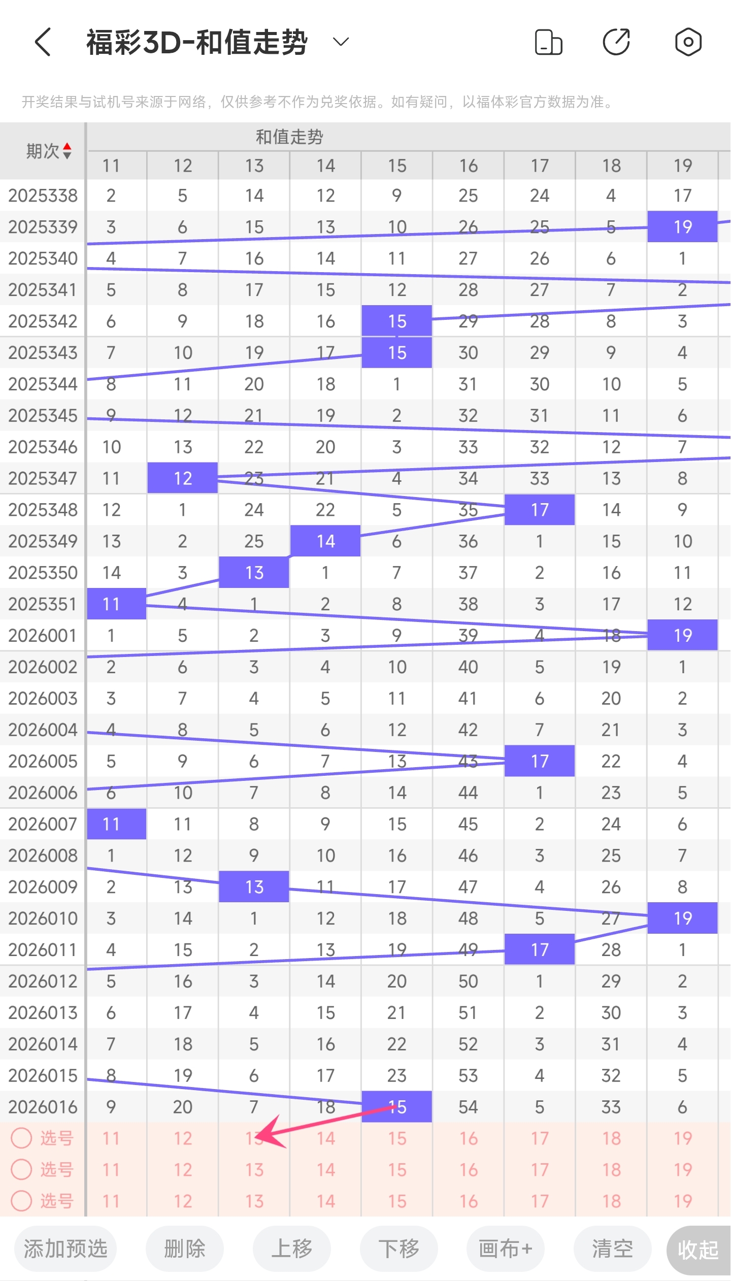 上期和值是15,往前一期和值是10。和值往右移动,偏移振幅为5。15值是处于近30期内开出中间的和值。上升的空间和下降的空间差不多,本期看好和值变小,所以本期趋势是大概率往左的。因此推测本期和值趋势是大概率往左的,和值变小,小概率往右,和值变大。