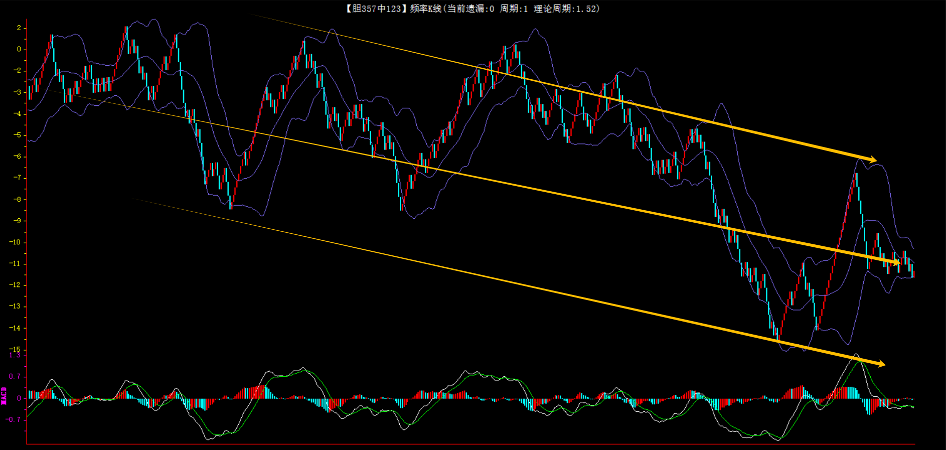 整体趋势下行,上边沿线趋势向下,下边沿趋势也是向下,节点震荡,当前开1期,本期防守。