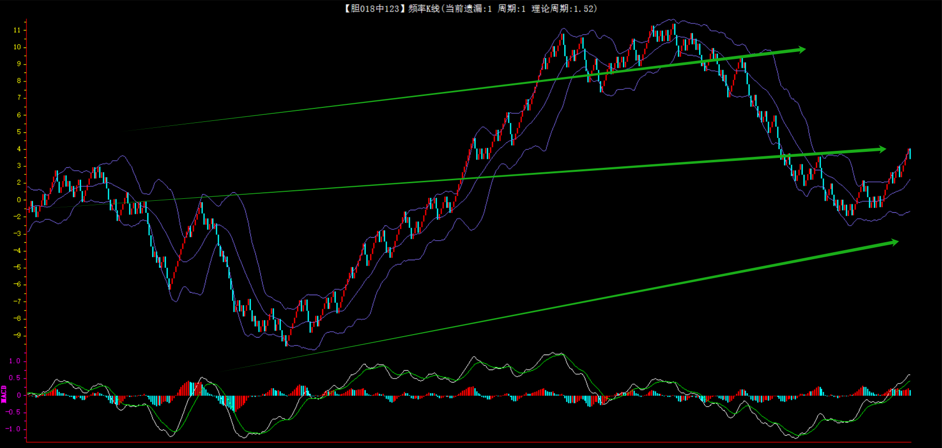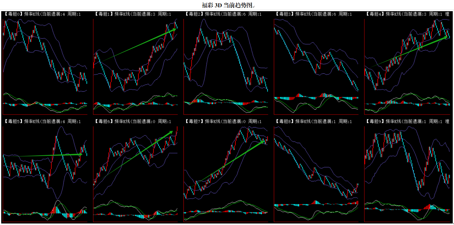 整体趋势上行,上边沿线趋势向上,下边沿趋势也是向上,节点震荡,当前遗漏1期,本期关注。