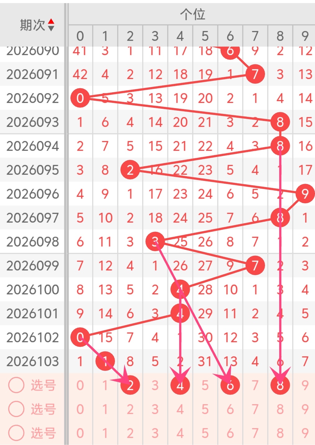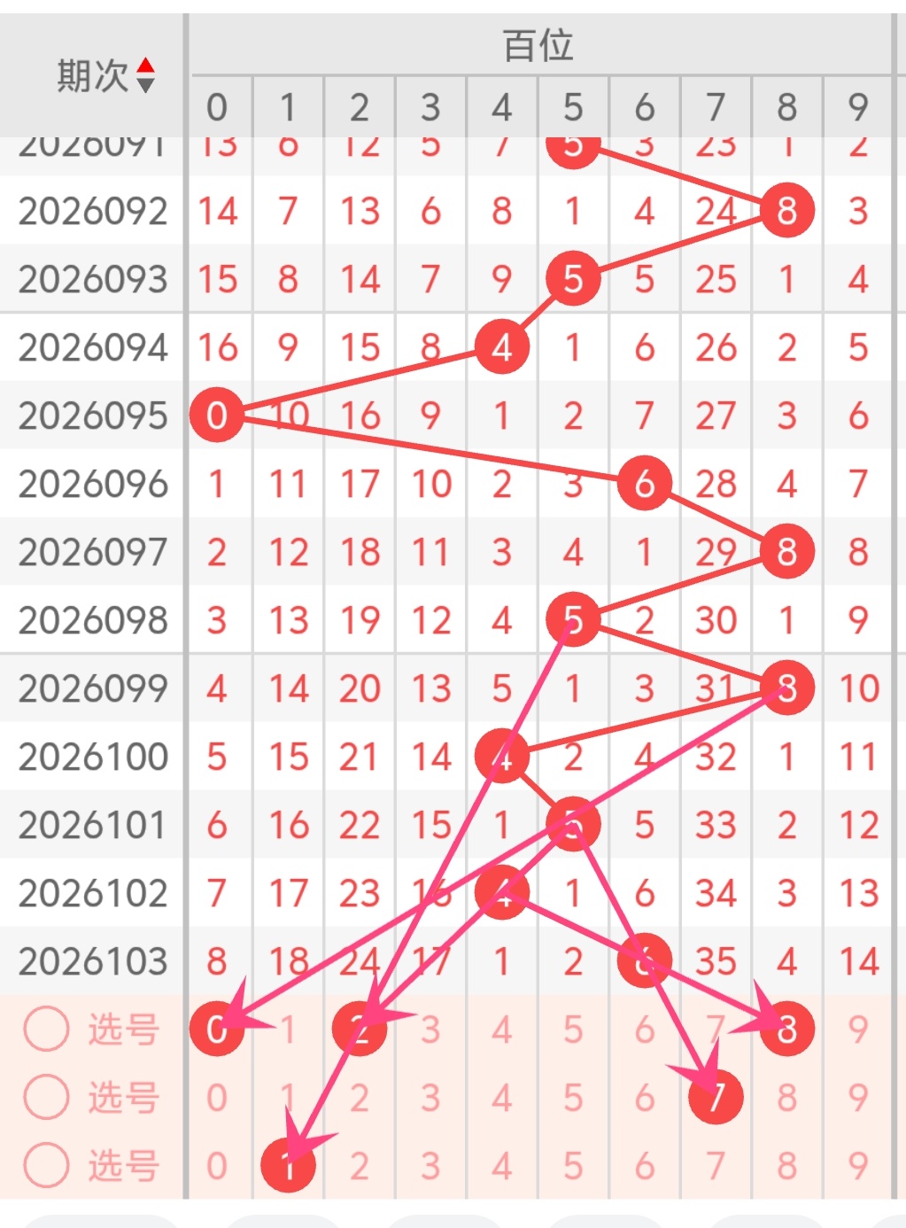 十位一直是三码当中走势最为平稳的位置,近期始终维持中区号码循环轮转,无大幅跨区跳号现象,整体走势规律相对规整。奇偶交替节奏清晰,呈现一奇一偶对称开出,路数分布三路号码轮换均匀。从遗漏值分析,十位部分冷号已达临界开出节点。今日十位依旧以中区号码为核心,兼顾小号防守,重点参考:1、5、7,整体延续温和震荡走势,不看极端偏号。再结合走势图延伸法。