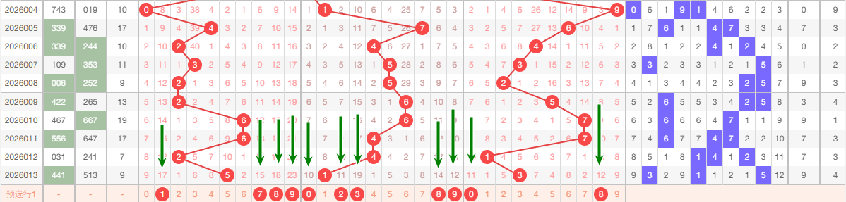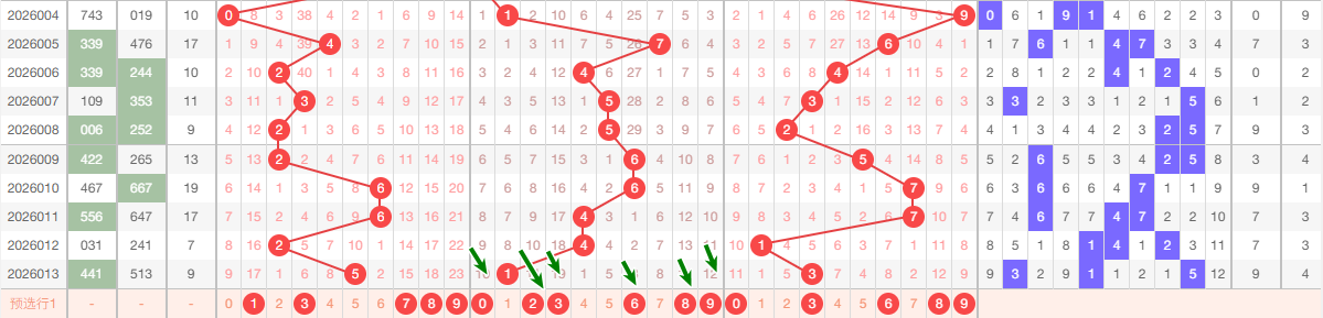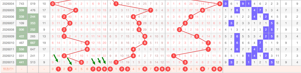 (二)、十位号码走势分析     上期十位开出1,本区与上期的跨度为3,本期我们重点关注 039,本期十位推荐关注:023689