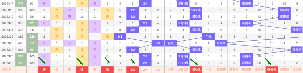 (二)、奇偶分析 奇数 13579 偶数 02468 在这5期 数据中 奇数出现8次 偶数出现 7次 从昨天出号来看奇数占优, 本期还是看好偶数有号 看好 偶偶偶 奇偶偶