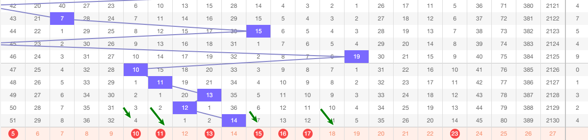 本期看好 范围5-23 之间定和值18-10-11-15从图上来看近5期的和值10 11 13 12 14 10 131路和值 12 0路和值 11 14 2路和值本期看好0路和值参考 这五期和值波动不大 下期防守大波动