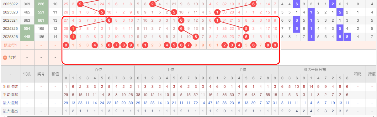 上期百位开出1,本区与上期的跨度为0,本期我们可以从上面走势图中看出选号的思路,本期百位推荐关注:084569