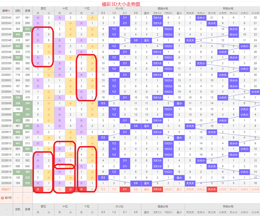 上期大小比为3:0,全大的号码组合方式,从近五期出现情况看,大号码出现8次,小号码出现7次,大小号码出现较平均,本期侧重两大的号码组合,本期百位侧重大号码,十位侧重小号码,个位要侧重看大,侧重大小大或者小小大的号码组合,根据大小做五码定位56789/01234/56789或01234/01234/56789