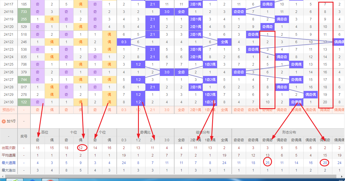 排列三 奇偶分析:从上图可以看出排列三100期内百位奇偶比为44比56,十位奇偶比为45比55,个位奇偶比为58比42,十位的比值比较均衡,但是百位的比值偏差就有点大,历史奇偶形态近2期开出奇偶偶后下一期的走势为,第84期开出奇偶偶后第85期开偶奇偶, 第92期开出奇偶偶后第93期开奇奇偶, 第101期开出奇偶偶后第102期开奇奇偶。本期应该重点关注奇偶偶或偶偶奇所以排列三第131期奇偶形态推荐奇偶偶或偶偶奇。
