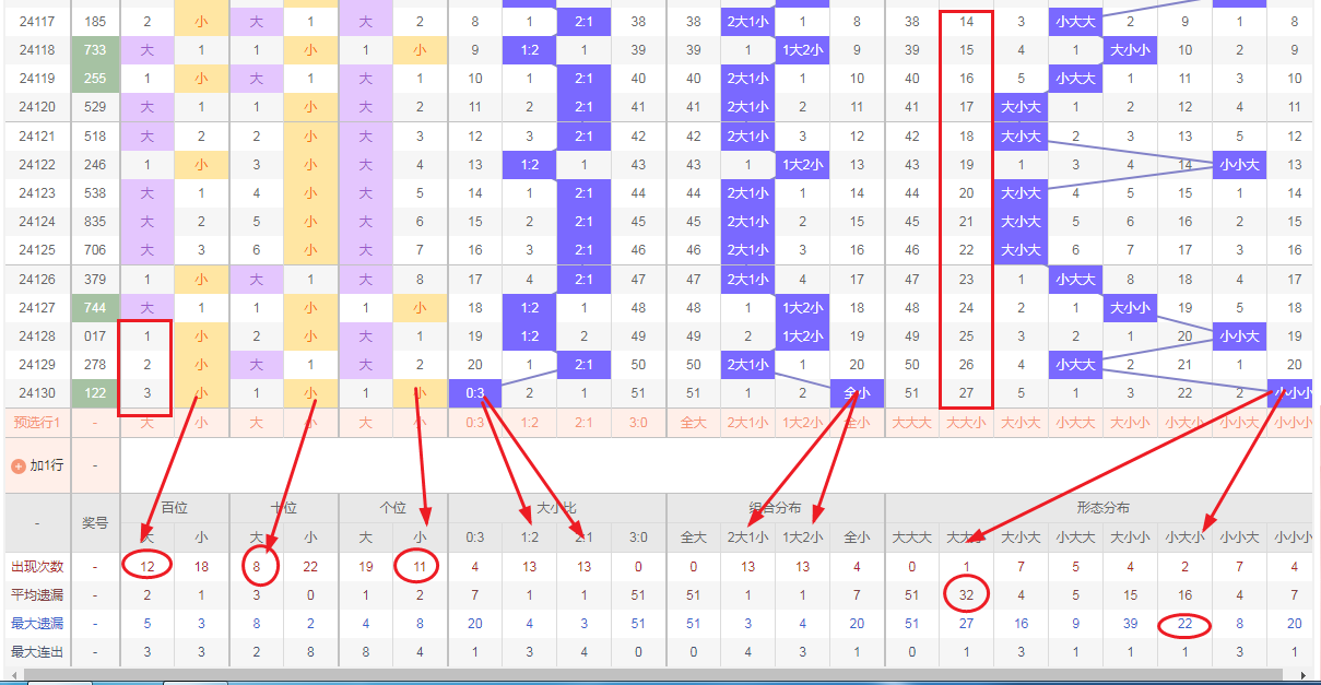 排列三 大小形态分析:从大小走势图上可以看出排列三100期内百位大小比为42比58,十位大小比为44:56,个位大小比为53比47除了个位奇数比偶数多,十位和百位都是偶数比奇数多。历史数据近3期开出小小小后下一期的走势为,第83期开出小小小第84期开大小大。第95期开出小小小后第96期开大大小,第84期开出小小小后85期开小大小。可以看出开出小小小形态后形态转变过快,不过还是能看出开出小小小形态后下一期还是比较规律的进行切换,这时遗漏数据就显示作用的时候,结合遗漏数据再加上开出小小小形态后容易进行下一个类型变化。所以排列三第131期大小形态推荐小大大防大小小。