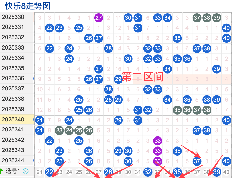 上期二区开出6个奖号(23.26.30.33.37.40)上期回顾二区开出6个奖号二区间在上期落位同比前期的话呈现了一个不变的落位趋势,先来看本期号码22整体活跃度较温热,在近 30 期里有一定的间歇性出现,不是每期都开,近期整体走势稍微稳定。号码28近期热度较温热,间隔性比较好,说明其在当前阶段活跃度较注意防守。号码35近期活跃度较热,有一定的间歇性近期整体走势相对平稳没有特别明显的冷热趋势变化,号码3930期内活跃度较热,没有明显的连续出现形态走势,整体表现比较动荡还是很稳定。