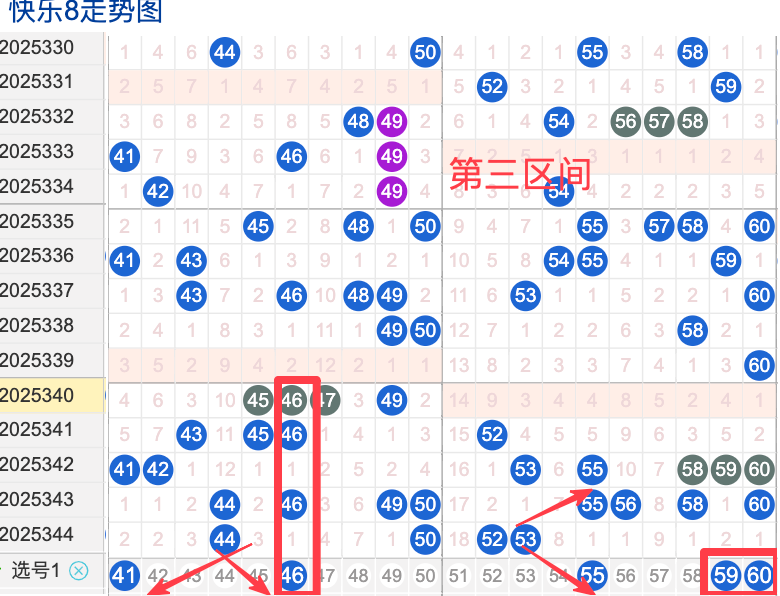 三区间开出了4个奖号(44.50.52.53)上期回顾三区开出4个奖号上期的三区间的奖号数量呈现一个递减的形态,4头回补1个,本期先来看号码41近期出现频率相对来说还是很稳定。偶尔有时间隔期数也是很长,说明其在近期的开奖中较温热的,号码46在近 30 期内出现次数相对还是稳定的号码,近期的活跃度也是较热。号码55有一定的间歇性,通常间隔5-4期会出现一次,没有明显的连续出现态势,走势相对较稳定,在整个第三区间的表现本期还是可以防守的。号码59走势相对近期较,近期没有连续间隔落号的情况,活跃度近期处于较状态注意防守。