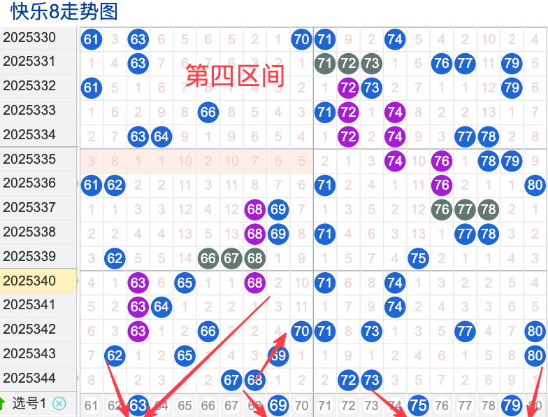 上期四区间开出了4奖号(67.66.72.73)上期的四区开4个奖号呈现了一个不变的趋势,开出的奖号7头回补两个6头回补2个,先来看号码63在近 30 期内属于还很稳定的号码,近期出现频率相对稳定的,偶尔会间隔多期后出现一次,这个号码要注意防守,号码69具有一定的间歇性活跃度较比如有时会间隔 35期就再次出现,也有时会间隔多期,近期整体出现频率比较,近期还是要关注的.号码79活跃度近期比较,有一定的间歇性。活跃度近期较热,整体走势有一定的波动性.