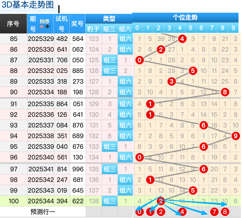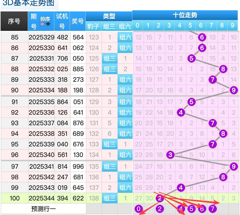 上期3D十位开出的奖号是2号,上期在十位上2号球这个号码在上期是一个冷码2跨回补的落位点,本期来看7号和6号球在十位上要注意这两个号码是有机会继续顺着上期的2号球继续走出两个常搭配落位趋势这里的两码注意防守一码就好了然后0号球还是一个冷回补的落位形态也是一个等差的落位形态4号球还是一个号码这里是一个热码折返落位点,再来看5号球是码的回补这个点位参考就好,9号球这里的号码要防守继续走出隔期回补的落位趋势